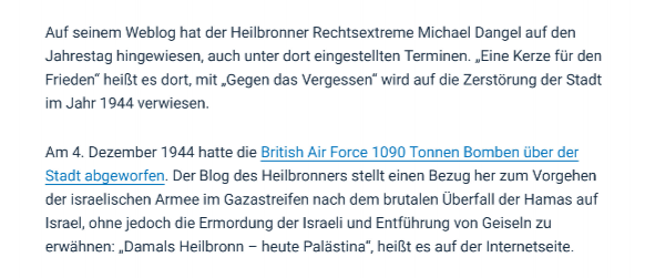 Dies sehen mit Sicherheit die Muslime in Deutschland so wie von Dangel dargestellt; hier konnten in wunderbarer Weise antisemitische Ressentiments bedient werden. Die politische Linke lehnt zwar den Gedankengang eines Kriegsverbrechens gegen unsere getöteten Heilbronner Mitbürger des 4. Dezember 1944 ab, stimmen aber mit der Einstufung der Regierung Netanjahu als Kriegsverbrecher überein. Hier Zustimmung, dort Ablehnung, in jedem Fall aber Aufmerksamkeit!